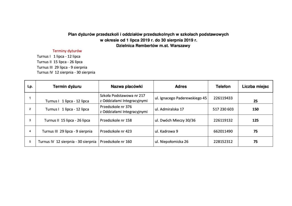 Już znane są terminy dyżurów wakacyjnych rembertowskich przedszkoli i oddziałów przedszkolnych w szkołach podstawowych. Rekrutacja przeprowadzona będzie podobnie jak w latach ubiegłych za pomocą elektronicznego systemu zgłoszeń wg ściśle określonego harmonogramu. Uruchomienie systemu planowane jest w kwietniu 2019 r.