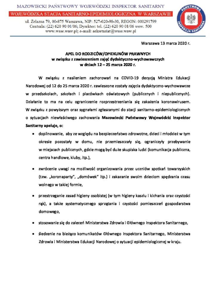 Apel Mazowieckiego Państwowego Wojewódzkiego Inspektora Sanitarnego By adminOn 16 marca 2020In Uncategorized