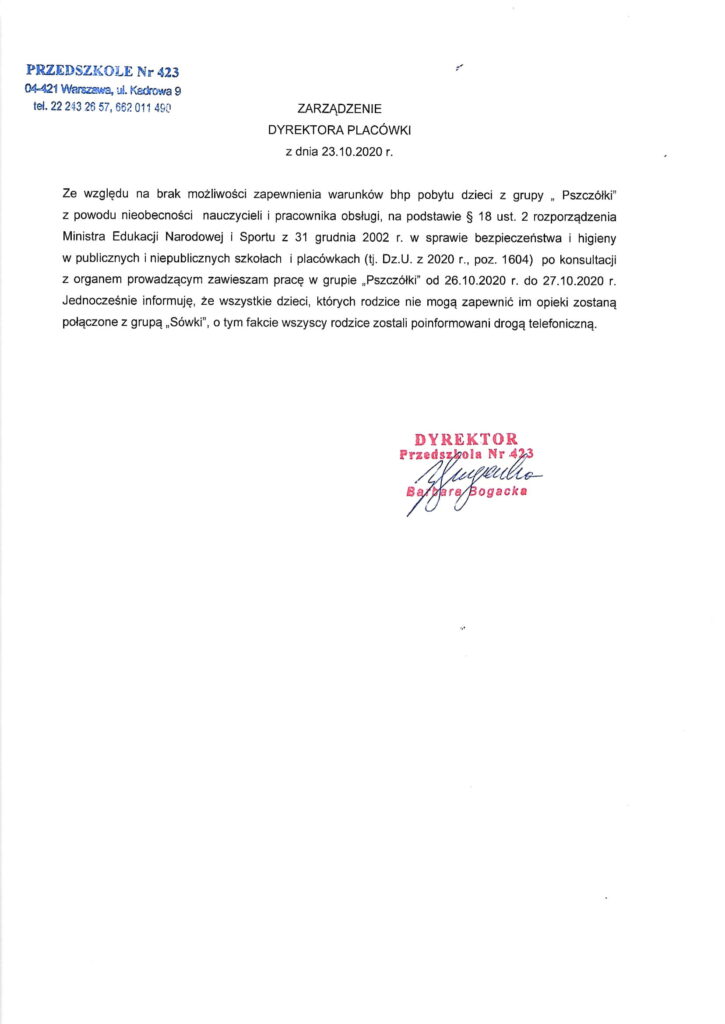 Zarządzenie Dyrektora o zamknięciu grupy „Pszczółki’