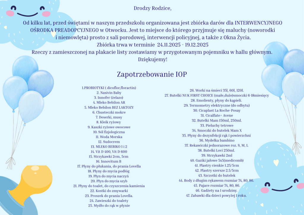 Zbiórka darów dla Interwencyjnego Ośrodka Preadopcyjnego w Otwocku By adminOn 28 listopada 2025In Uncategorized
