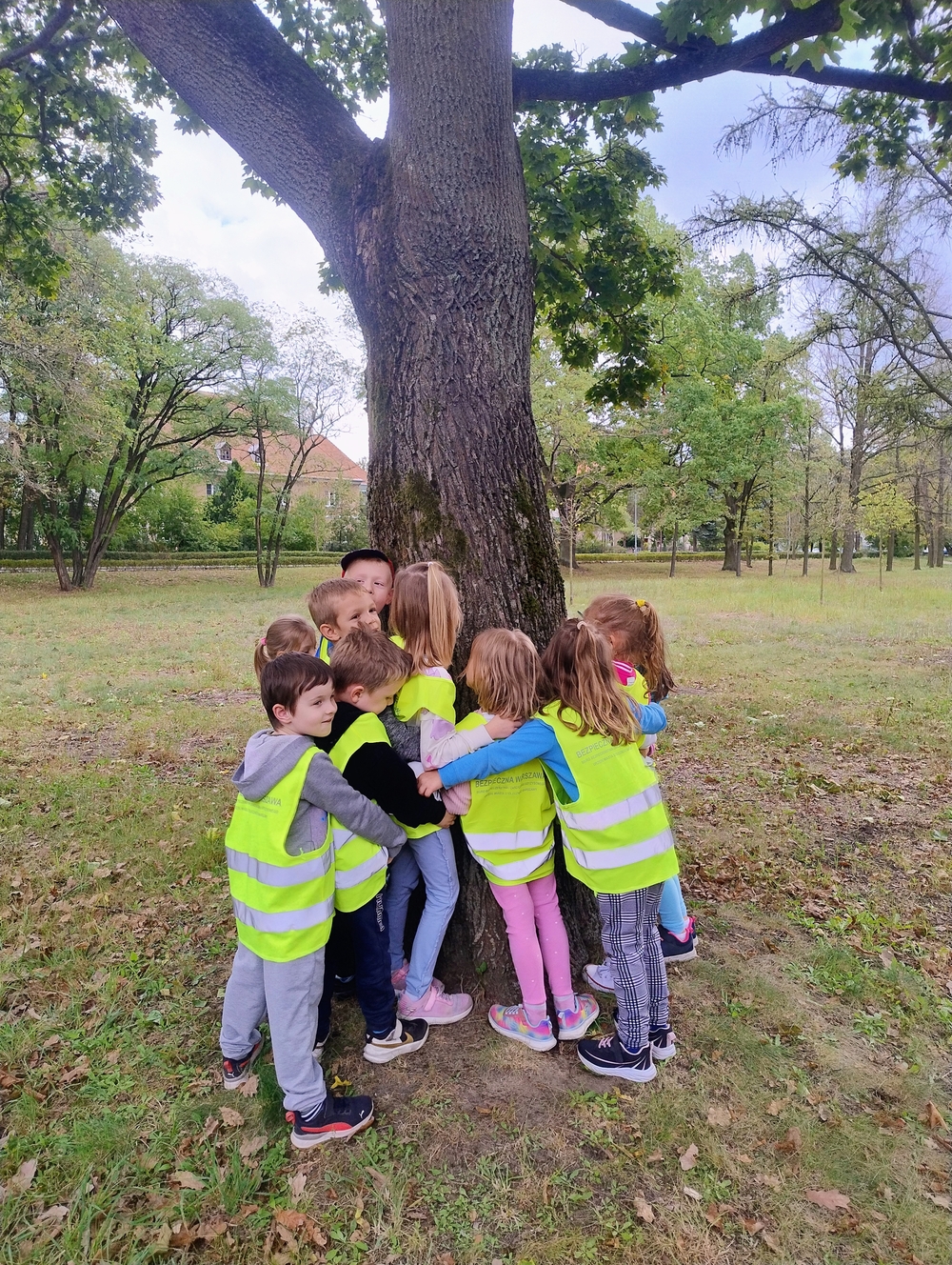Nasze przedszkolaki wzięły udział w ogólnopolskiej akcji „Przytul się do drzewa”. Kampania ta polega na wspólnym, fizycznym kontakcie z drzewem, który ma na celu budowanie świadomości na temat znaczenia lasów i natury oraz edukację na temat bezpiecznego zachowania w lesie. W ramach akcji dzieci przytulają się do drzew, pokazując swoją miłość do przyrody, a także ucząc się o pozytywnym wpływie zielonej energii drzew na samopoczucie i relaks.