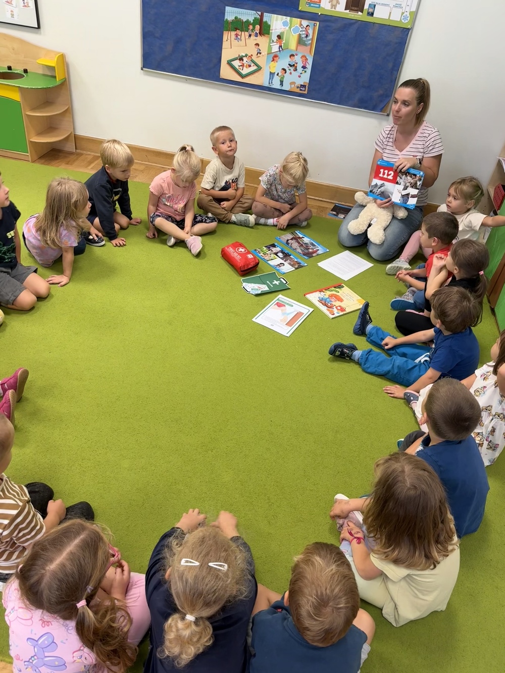 W piątek 12 września we wszystkich grupach obchodziliśmy Dzień Pierwszej Pomocy. Zajęcia edukacyjne miały na celu zapoznanie dzieci z podstawowymi zasadami bezpieczeństwa oraz udzielania pierwszej pomocy w prostych, codziennych sytuacjach. Spotkanie rozpoczęło się rozmową na temat numerów alarmowych oraz tego, do kogo można zwrócić się o pomoc w razie niebezpieczeństwa. Dzieci dowiedziały się, jak prawidłowo wezwać pogotowie, straż pożarną i policję, a następnie ćwiczyły wybieranie numeru 112 i przekazywanie najważniejszych informacji: kto potrzebuje pomocy, co się stało i gdzie się znajdują.