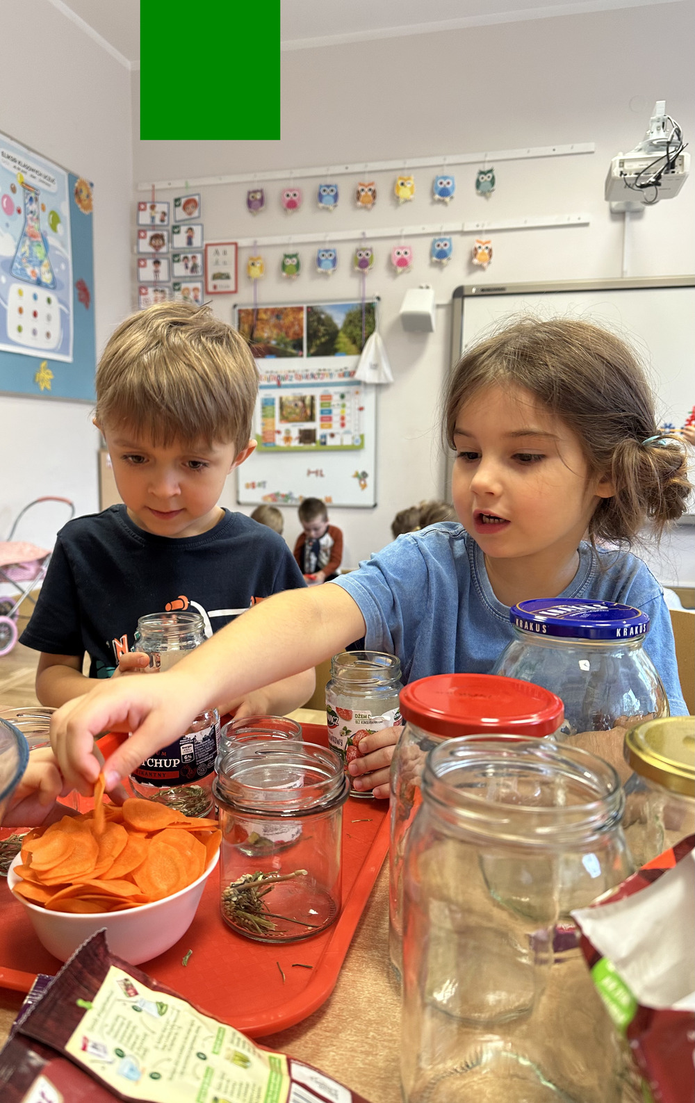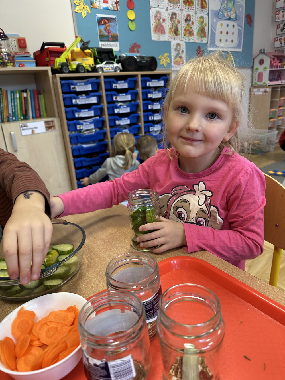 Dzieci z grupy „Sówki” z wielkim zaangażowaniem i uśmiechem, przygotowały przetwory na zimę –buraczki i chrupiące ogórki. Mali kucharze samodzielnie układali warzywa w słoikach i dodawali przyprawy, tworząc wyjątkowe kompozycje smaków i zapachów. To było nie tylko świetne doświadczenie kulinarne, ale też doskonała lekcja współpracy, cierpliwości i poznawania tradycji. Teraz nasze słoiczki będą czekały, by zimą przypomnieć nam o tych ciepłych, wspólnych chwilach.