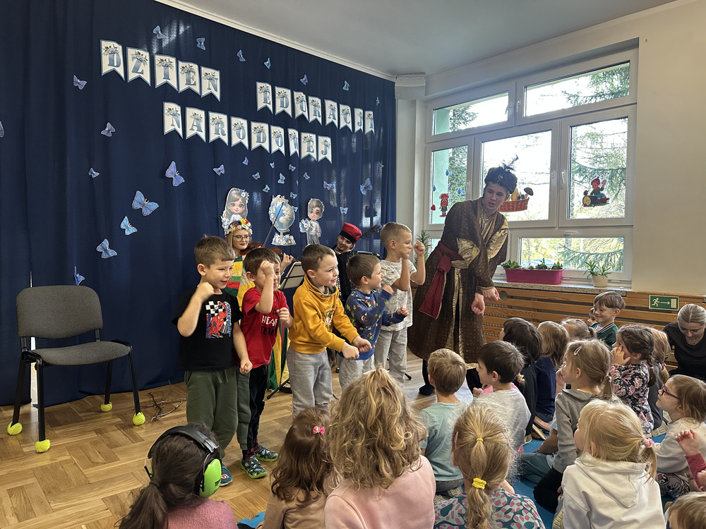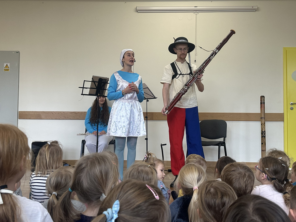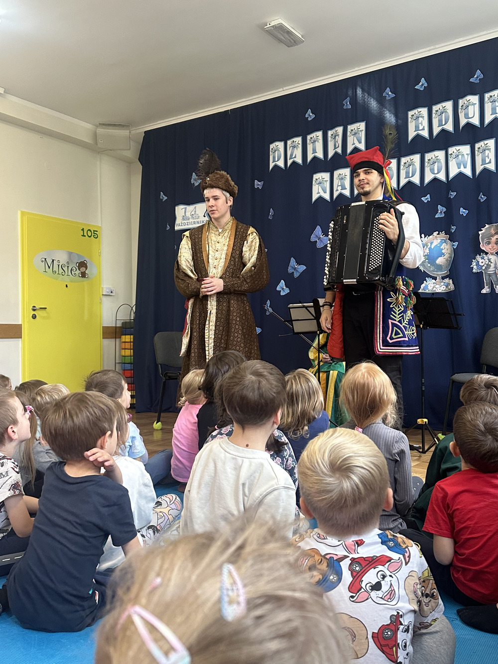 W październiku w naszej placówce odbyły się dwa niezwykłe koncerty muzyki klasycznej. Dzieci miały okazję uczestniczyć w dwóch wyjątkowych przedstawieniach: „Bal w szmaragdowej dolinie” oraz „Baśń w poszukiwaniu najpiękniejszego polskiego tańca”. Podczas występów artyści przenieśli publiczność w magiczny świat muzyki, tańca i wyobraźni. Wspaniałe interpretacje muzyczne połączone z barwną oprawą sceniczną sprawiły, że każdy dźwięk stał się częścią opowieści pełnej emocji, rytmu i harmonii. Szczególną atrakcją koncertu była możliwość poznania brzmienia instrumentów muzycznych. Aktorzy zagrali na skrzypcach, akordeonie, flecie poprzecznym oraz fagocie, dzięki czemu dzieci mogły z bliska zobaczyć, jak wyglądają te instrumenty i jak różnorodnie potrafią brzmieć. To wyjątkowe spotkanie z muzyką klasyczną nie tylko dostarczyło wielu artystycznych wrażeń, lecz także rozbudziło wśród najmłodszych wrażliwość estetyczną, ciekawość świata dźwięków oraz zamiłowanie do sztuki.