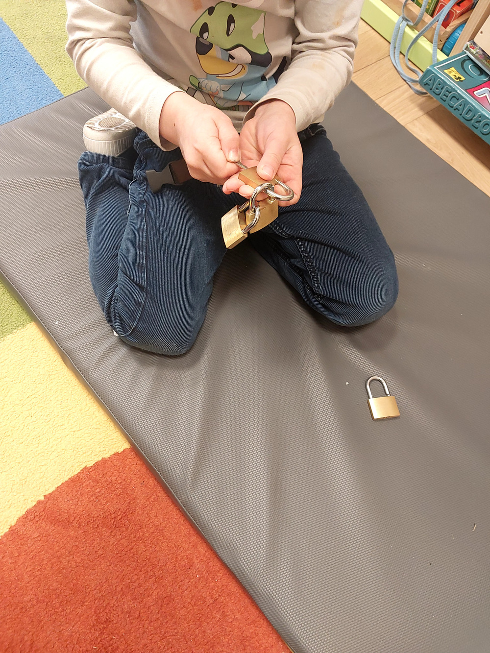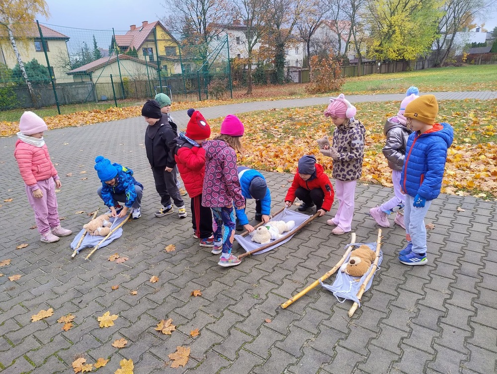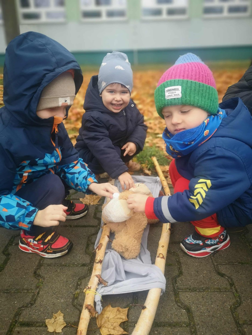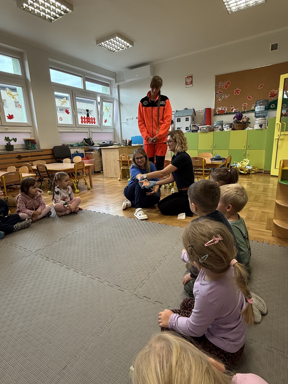 Podczas zajęć omówiono również podstawowe zasady bezpieczeństwa:  w domu i na placu zabaw, jak zachować spokój i nie wpadać w panikę. Dzieci mogły zobaczyć i dotknąć prostych materiałów opatrunkowych – bandaży, plastrów i opasek – a także samodzielnie ćwiczyły opatrywanie „ran” na pluszakach oraz na kolegach i koleżankach w parach.