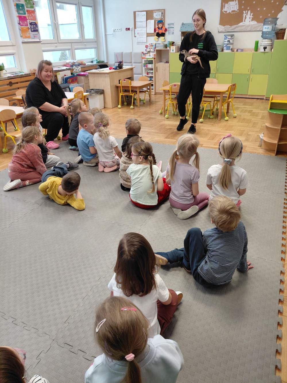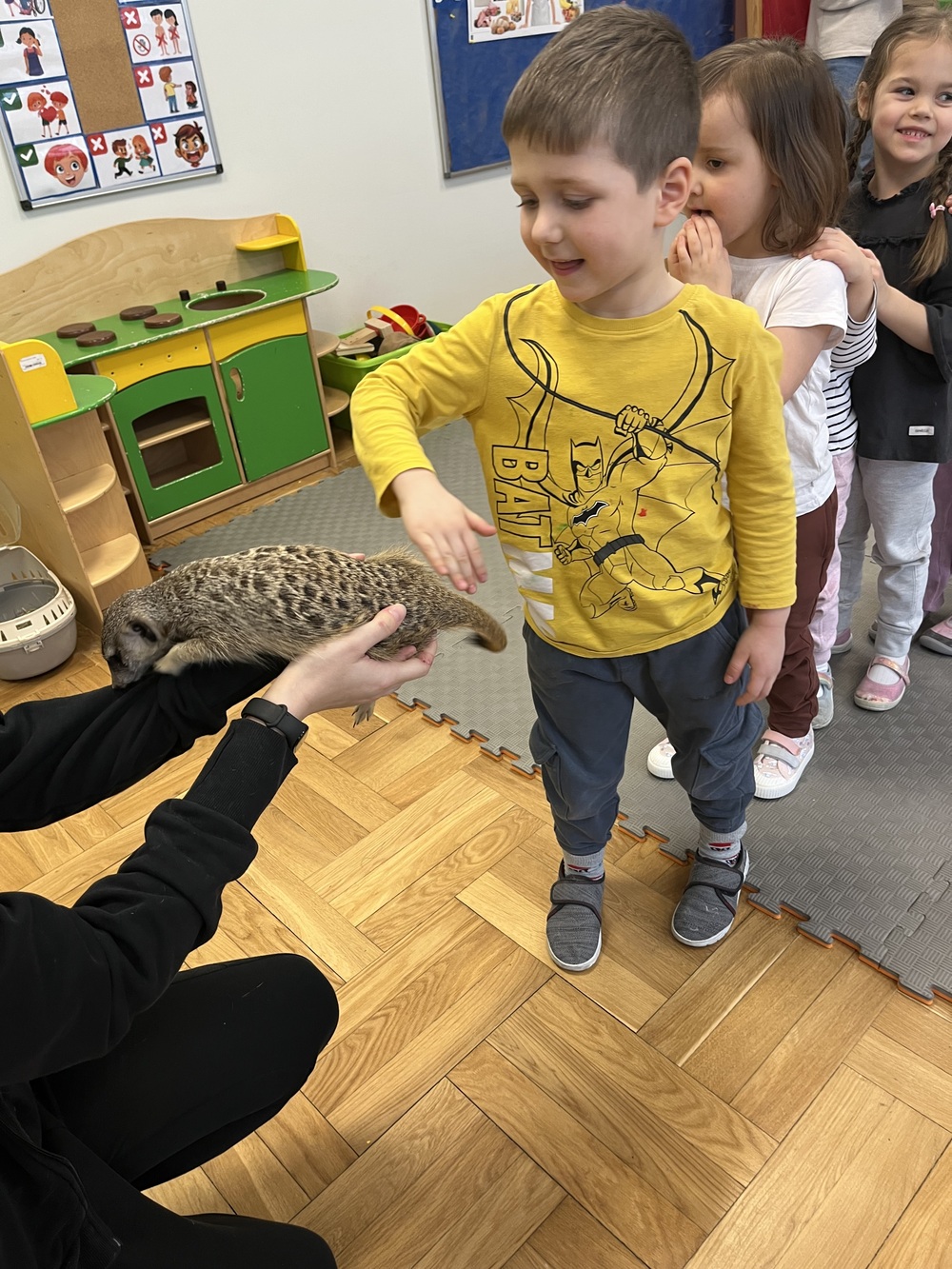 Dnia 17 lutego w naszym przedszkolu odbyły się warsztaty z Surykatką. To małe, egzotyczne zwierzątko od razu wzbudziło ogromne zainteresowanie dzieci. Podczas spotkania przedszkolaki dowiedziały się, gdzie żyją surykatki, co jedzą i jakie mają zwyczaje. Dzieci chętnie zadawały pytania, na które nasz gość odpowiadał. Największą atrakcją była możliwość pogłaskania surykatki. Dzieci były zachwycone tą niezwykłą lekcją przyrody. Spotkanie dostarczyło im wielu emocji i poszerzyło ich wiedzę o świecie zwierząt, pozostawiając piękne wspomnienia.
