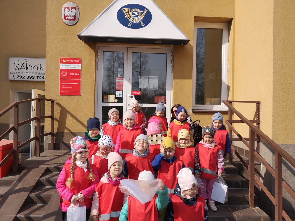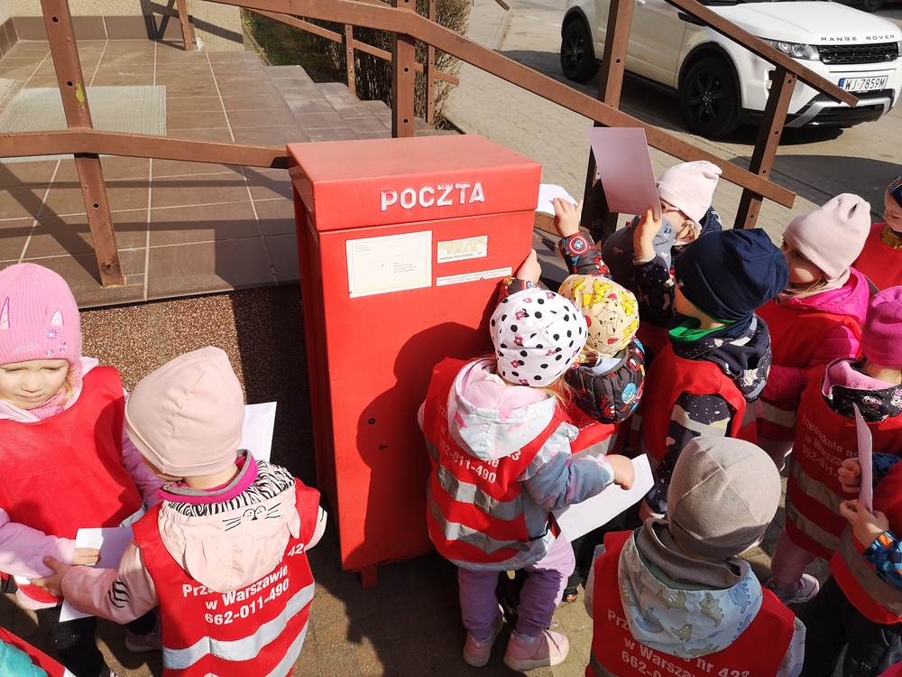 Grupa Biedronek wybrała się na pocztę, aby poznać jej funkcjonowanie i wysłać list. Przed wyjściem dzieci przypomniały zasady bezpieczeństwa. Na miejscu przywitał nas pracownik, który opowiedział o swojej pracy oraz wyjaśnił, jak wygląda droga listu od nadawcy do odbiorcy i jakie są rodzaje przesyłek. Dzieci miały okazję zobaczyć okienko pocztowe, skrzynki na listy oraz znaczki i koperty. Następnie samodzielnie przygotowały i wrzuciły list do skrzynki. Wycieczka była ciekawa i dostarczyła wielu nowych doświadczeń